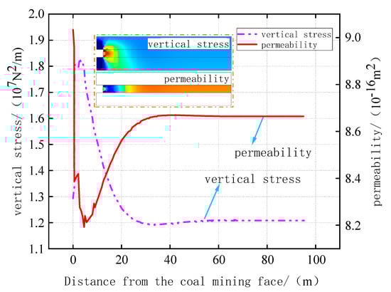 Following coal seam excavation, the distribution of vertical stress and corresponding permeability characteristics in the region ahead of the mining face are illustrated in Figure 3. As shown in Figure 3, the vertical stress ahead of the mining face can be categorized into three distinct zones: the pressure-relief zone, the stress concentration zone, and the original stress zone.
