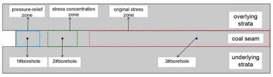 To evaluate the influence of varying drainage negative pressures on gas extraction efficiency, three boreholes were strategically positioned within the pressure-relief, stress concentration, and original stress zones ahead of the mining face for simulation analysis. A schematic illustration of the borehole placement is presented in Figure 4.