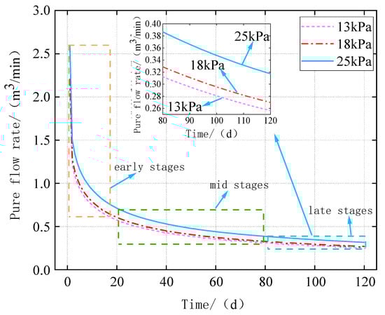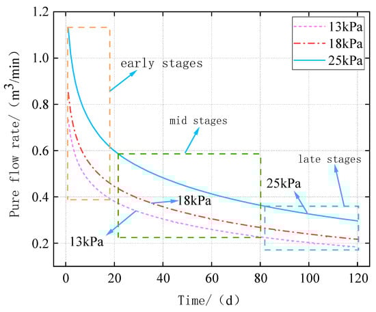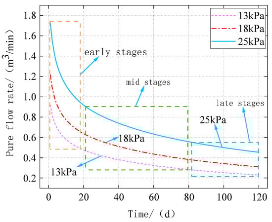 As shown in Figure 9, since the original stress zone remains unaffected by mining disturbances, the permeability of the coal matrix retains its initial state. Gas flow primarily occurs through pre-existing fractures in the coal. Regarding the early stage of drainage, the large pressure differential between the internal gas pressure and the drainage negative pressure causes a rapid decline in gas pressure, leading to a sharp drop in the pure gas flow rate. The higher the applied negative pressure, the faster the decline. For instance, under negative pressures of 13 kPa, 18 kPa, and 25 kPa, the pure gas flow rates decreased by 0.45 m3/min, 0.58 m3/min, and 0.81 m3/min, respectively, during the first 0–20 days. In the mid-to-late stage of drainage, as the pressure differential gradually decreases, the rate of decline in gas flow slows. However, due to the relatively stable gas content in the coal, the flow rate stabilizes at a relatively high level. Further increasing the negative pressure can enhance gas drainage efficiency during this phase.