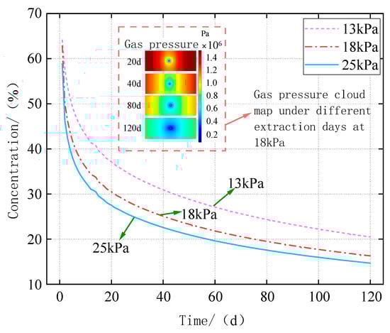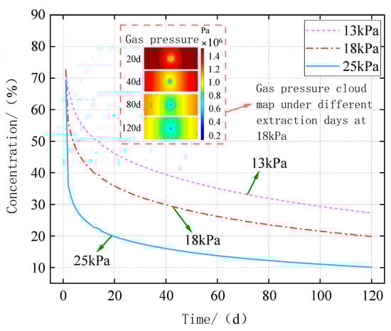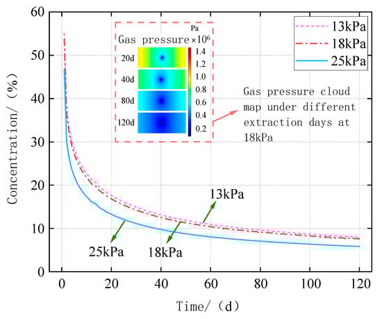 As shown in Figure 8, due to low permeability and limited air leakage under lower negative pressures, gas concentration decreases more slowly during the early drainage stage than in the pressure-relief zone. Furthermore, in the mid-to-late stages, gas concentration tends to stabilize at relatively higher levels. After 80 days, gas concentrations under 13 kPa and 18 kPa were 31.9% and 37.1%, respectively. However, under 25 kPa, although the pure gas flow rate was higher, the intensified air leakage due to the elevated negative pressure accelerated the decline in gas concentration. Within the first 20 days, the gas concentration dropped by 45.6%, reaching 12.2% by day 80. In the stress concentration zone, high negative pressure should be applied during the initial drainage stage to effectively reduce the gas content in the coal matrix. In the mid-to-late stages, once the gas content falls below the safety threshold and gas concentration declines, reducing the negative pressure can help improve gas concentration levels.