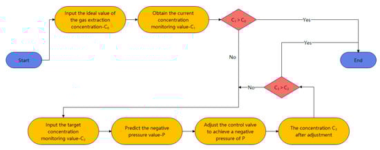 First, an ideal gas drainage concentration value (C0) is set as the control target. The actual on-site monitored concentration (C1) is then collected and compared with C0. If C1 ≥ C0, no adjustment is required. However, if C1 < C0, the system enters the concentration regulation mode.