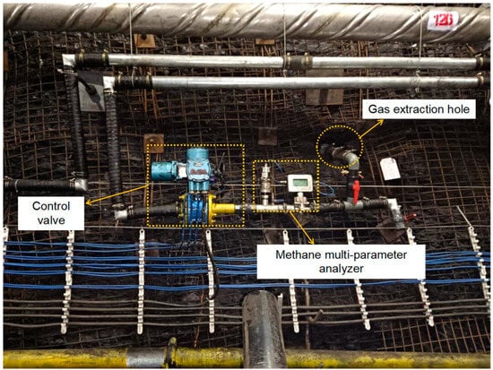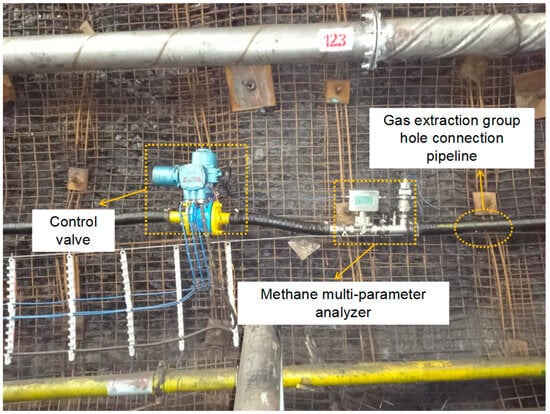 To validate the accuracy of the above research and assess the applicability of the proposed dynamic regulation strategy for drainage negative pressure, intelligent gas drainage regulation was implemented on-site. Control valves were installed in the pressure-relief zone, stress concentration zone, and original stress zone along the belt roadway of the working face.