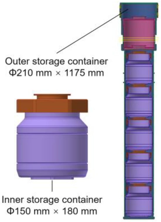 The storage containers for metal oxides are shown in Figure 1. The metal oxides are loaded into the inner container, and the sealing of the inner container is realized through threading. Five inner containers are loaded into one outer container, and then the sealing of the outer container is realized through welding. Inner containers are numbered 1 to 5 from top to bottom. The inner and outer containers are made of 304 stainless steel, with an inner container size of Φ 150 mm × 180 mm and an outer container size of Φ 210 mm × 1175 mm. The inner container has a volume of about 2.255 L, the designed filling capacity is 3.0 kg, and the actual filling capacity is between 2.6 and 3.2 kg.