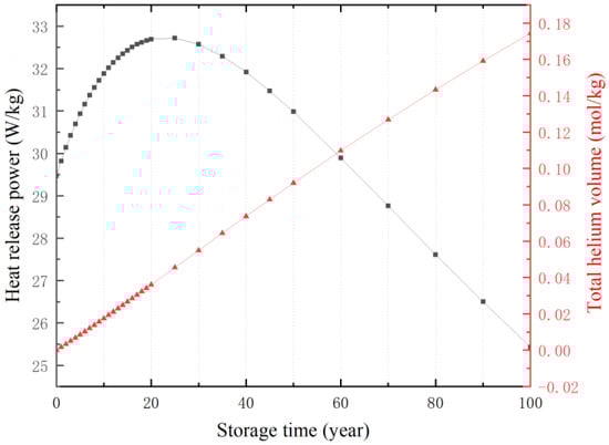 Radioactive metal oxide heat release power and cumulative amount of helium produced.