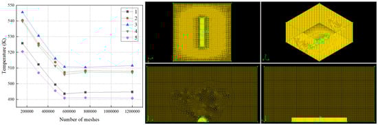 Based on the container storage method, the space area for numerical simulation was defined as 2000 mm × 2000 mm × 2000 mm, and the outer container was placed in the center of this area. In order to facilitate the production of high-quality meshes, the storage containers were regularized while maintaining the effective volume of the inner storage containers, and the air between the inner and outer containers was also regularized. The wall thickness of the inner container was regularized as a 4 mm cylinder, and the five inner containers were placed in the outer bottle in the form of a top and bottom stack. In order to reduce the number of grids and the workload of simulation calculation, according to the principle of symmetry, the simulation area is halved, and the corresponding containers are cut in half vertically from the center of the axis so that the corresponding gridding and simulation calculation area coordinates range from X = −1000 mm~1000 mm, Y = 0 mm~1000 mm, and Z = −1000 mm~1000 mm. The meshes and mesh sensitivity analysis are shown in Figure 3, and the maximum temperature of the metal oxides inside the five inner containers (storage conditions: cooling air temperature 308 K, storage for 25 years) is used as an index for the sensitivity analysis of the number of meshes. The results show that when the number of meshes reaches about 550,000, the temperature change of the metal oxides inside the five inner containers is insensitive. Therefore, the number of hexahedral meshes used in this paper is 556,607, and the maximum mesh skewness is 0.4153.