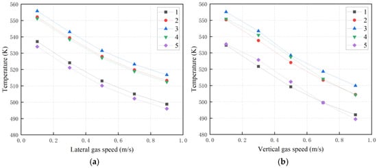 (a) The effect of lateral gas speed on the temperature of the inner container; (b) The effect of vertical gas speed on the temperature of the inner container.