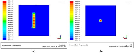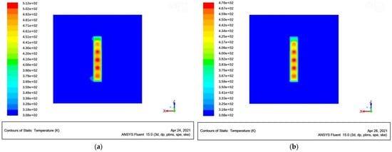 Water in metal oxides is converted to water vapor at high temperatures, and water vapor is converted to hydrogen in a radiation environment. When the metal oxide is dry, 1 kg of the metal oxide produces about 0.00495 mL to 0.01021 mL of hydrogen per day; when the relative humidity of the water vapor is 50%, 1 kg of the metal oxide produces about 0.00911 mL to 0.18333 mL of hydrogen per day. When 3 kg of the metal oxide has a water content of 0.5%, the mass of the water is 15 g, and the corresponding standard volume of hydrogen gas is about 18,666.7 mL. According to the upper limit of the rate of hydrogen produced by irradiation under dry conditions, it takes about 1669 years to irradiate water into hydrogen completely; according to the maximum rate of hydrogen produced by irradiation when the relative humidity of water vapor is 50%, it takes about 93 years to irradiate into hydrogen completely. This shows that it takes a long time for water to be converted entirely to hydrogen due to the irradiation of metal oxides. Since it is difficult to characterize the amount of water vapor and hydrogen produced quantitatively, we calculated the temperature distribution in two states, where water vapor is completely converted to hydrogen and is not converted to hydrogen at all. As shown in Figure 8, when 0.5% water in the metal oxide is completely converted to water vapor, the heat transfer effect is better than the conversion to hydrogen. The temperature difference between the two cases can be up to 64.5 K. This is due to the absorption ability of water vapor for infrared wavelengths, which leads to the fact that the water vapor can absorb radiative heat transfer, which is conducive to enhancing the heat transfer effect of the gas mixture on the heat production of the metal oxide.