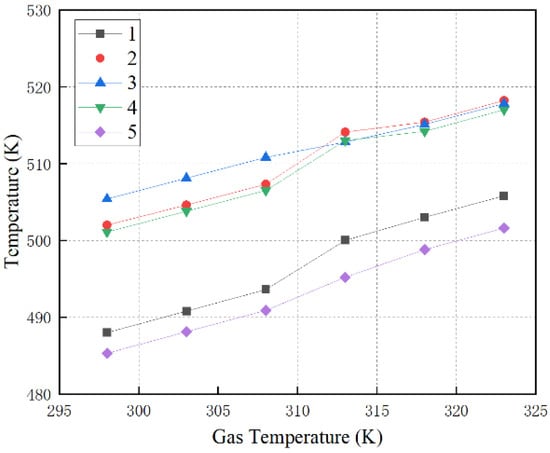 The effect of ventilation gas temperature on the temperature of the storage vessel is shown in Figure 6, which demonstrates the maximum temperature of metal oxides stored for 25 years in each of the five inner containers at ventilation temperatures from 298 K to 323 K, respectively. The maximum temperatures of metal oxides keep increasing linearly with the increase in ventilation gas temperature. When the ventilation temperature is lower than 308 K, due to the low ventilation temperature, the outermost container dissipates heat quickly, and the heat is conducted from the middlemost container to the two ends, which is manifested as the highest temperature of the middlemost container. When the ventilation temperature is greater than or equal to 313 K, the heat dissipation of the outermost container is not effective, resulting in the middle three containers reaching thermal equilibrium.