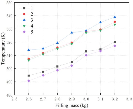 Effect of filling mass on maximum temperature of metal oxides in five inner containers at 25 years.