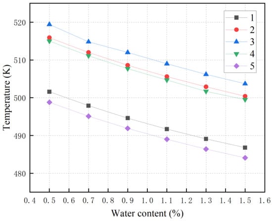 Since the irradiation of water into hydrogen is more unfavorable to the storage of metal oxides, according to the conservative principle, we assume that all the water in the metal oxides is irradiated into hydrogen and carry out the calculation of the temperature of the metal oxides with a water content of 0.5~1.5% stored for 25 years, in which the other boundary conditions are as follows: transverse air velocity of 0.5 m/s, air temperature of 308 K, loading of 2.8 kg, and the density of the heap is 1331 kg/m3. The results of the computational fluid dynamics simulation are shown in Figure 9. The temperature of the metal oxide decreases with the increase of water content. The temperature of the metal oxide with 1.5% water content is 15.7 K lower than that of the metal oxide with 0.5% water content, which is mainly due to the fact that hydrogen generated by water irradiation has a better heat transfer property than that of air and helium.