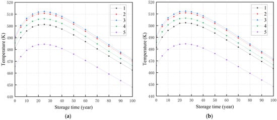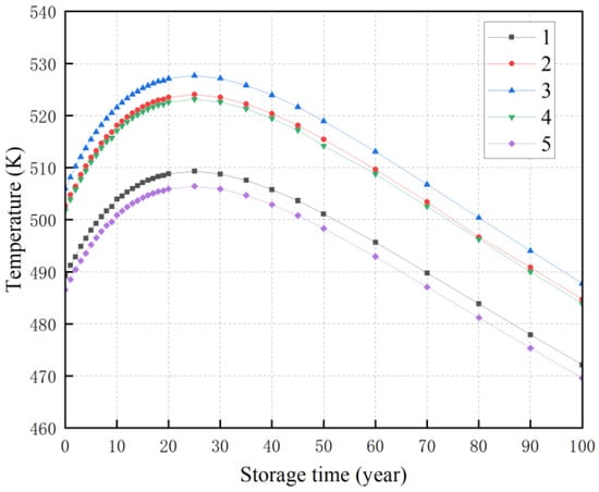 The tightness of metal oxide stacking in the vessel mainly affects the thermal conductivity and heat transfer. In order to investigate the effect of stacking density on heat transfer, the lower region of each inner container was therefore partitioned and gridded according to different stacking densities (2200 kg/m3, 2500 kg/m3) corresponding to the loading height. Under normal storage conditions (air velocity of 0.5 m/s, air temperature of 308 K, and moisture content of 0.5%), simulations were performed to calculate the temperature trends as the storage year changed. Figure 10 and Figure 11 show the variation of metal oxide temperature with time for heap densities of 1331 kg/m3, 2200 kg/m3, and 2500 kg/m3, respectively. The temperature corresponding to the heap density of 1331 kg/m3 is obviously higher than that at other heap densities, while the difference between the mutual temperatures of the heap densities of 2200 kg/m3 and 2500 kg/m3 is less obvious. The metal oxides showed the highest material temperatures in the third inner container under normal dry storage conditions, with peak temperatures occurring near the 25th year at a maximum of 527.6 K.