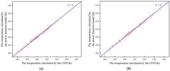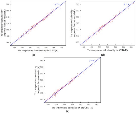 The parameters b0~b7 of the power functions for various temperatures can be obtained using the nonlinear optimization technique in Matlab R2020a software. The optimized model parameters for various temperatures are shown in Table 3, and the statistical analysis data for the power function are shown in Table 4. According to the statistical parameters of the model in Table 4, the statistical data of the model parameters corresponding to various temperatures can prove that the power function model is suitable. All of them satisfy the judgment criteria of P2 > 0.9 (more significant than 0.9999) and F > 10 FT (=19.9). The correlation index R2 of the temperature power function model is more significant than 0.986, the average relative error between the calculated value of the temperature model and the simulated value is less than 0.38%, and the maximum relative error between the calculated value of the power function model and the simulated value is less than 1.80%. The effect of the simulated calculated temperature and power function model calculated temperature is shown in Figure 12a–e. Both the model statistics and the simulated regression effect of the data proved that the temperature power function influence model proposed in this study has good accuracy and can be used for temperature calculation in practical work.