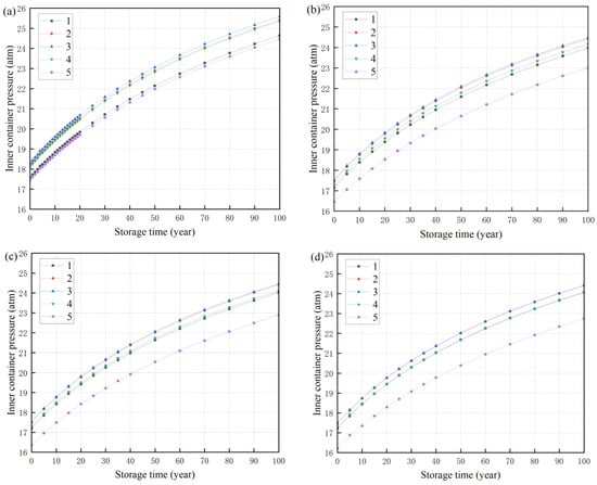 Figure 13 shows the trend of the gas pressure in the inner vessel with time during storage for metal oxides of different stack densities. The continuous generation of helium from the decay of the metal oxides during storage does not decrease gas pressure even after the temperature peak has passed during storage. At the exact moment, containers with higher temperatures have higher internal pressures. Since the different stack densities of the metal oxide charge result in different heat transfer of the material, the higher the stack density, the lower the average temperature of the material, so the pressures at the other stack densities (2000 kg/m3, 2200 kg/m3, and 2500 kg/m3) are relatively low compared to the pressure at the 1331 kg/m3 stack density. The maximum pressure in year 0 is about 17.5 to 18.3 atm, and in 100 years of storage, the maximum pressure is about 24.5 to 25.6 atm.