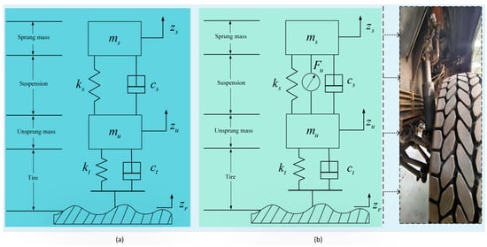 Schematic diagram of the one-sixth suspension system: (a) passive suspension model, (b) active suspension model.