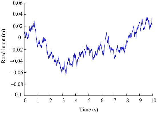Based on the random road excitation model defined in Equation (9), the Class C road condition was selected, the vehicle speed was set to 10 m/s, the lower cutoff frequency was set to 0.01 Hz, the noise intensity was set to 0.1 dB, the simulation time was set to 10 s, and the simulation step length was set to 0.01 s. The Class C road excitation generated under this condition is shown in Figure 2.