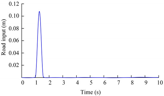 Shock excitation is usually caused by large bumps or potholes in the road surface, and its mathematical description often adopts a step function, pulse function, or sine function to simulate the actual bumps or potholes [23]. When the vehicle drives into the condition of the raised road surface with the height and the length at the time at the speed , the sine wave signal is used as the input excitation. Figure 3 shows the time-domain signal of the raised road surface excitation.
