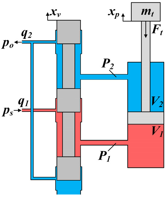 The structural form of an active suspension electro-hydraulic servo actuator is usually a electro-hydraulic servo valve control hydraulic cylinder, mainly including electro-hydraulic servo valve, hydraulic cylinder, load, and so on. In this paper, a valve-controlled asymmetrical hydraulic cylinder was selected as the structure of the electro-hydraulic servo actuator. The principle diagram of the active suspension electro-hydraulic servo actuator system is shown in Figure 4.