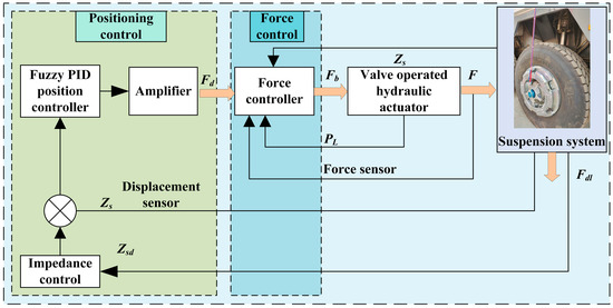 In this section, the dynamic relationship of position tracking and force feedback is used to achieve the optimal control of suspension system. Figure 5 shows the structure of the active suspension control system, including a force controller, a position controller, and an impedance control for position tracking [25]. The system adopts a hydraulic servo actuator as the actuator. Although the hydraulic circuit has advantages such as high precision and large power to mass ratio [26], the hydraulic servo system can quickly respond to changes in input and output displacement and force, but due to the nonlinear characteristics of the hydraulic system and the correlation between the actuating force of the hydraulic cylinder and the vehicle body movement, the system error will inevitably increase.