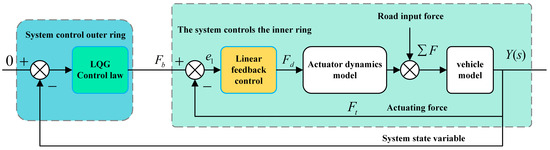 The force control system adopts a double-loop structure; the inner loop control adopts linear feedback control, and the outer loop control adopts linear quadratic Gaussian (LQG) control. The LQG optimal controller generates the target control force, which is transmitted to the inner control ring as the input signal. The inner loop performs feedback control and feeds the control signal into the vehicle model. The real-time state variable of the vehicle is used as the output signal of the inner loop and fed back to the LQG controller. The structure of the force feedback optimal control system is shown in Figure 6.