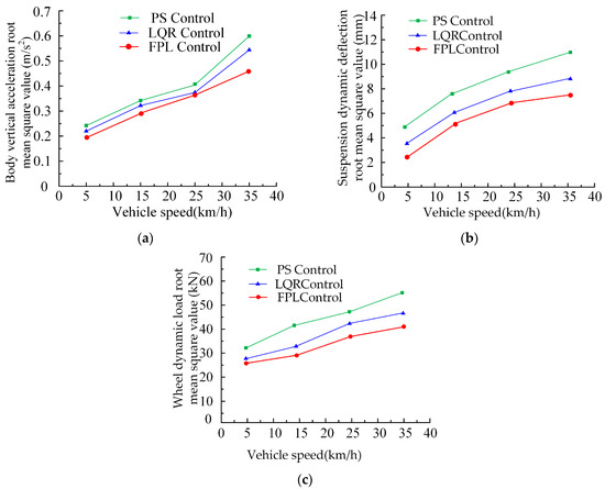 Taking the C-class road as an example, the FPL control strategy proposed in this paper is compared with the LQR control and PS control strategies. When the vehicle speed is about 5 km/h, 15 km/h, 25 km/h, and 35 km/h, respectively, the root-mean-square values of the body vertical acceleration, suspension dynamic deflection, and wheel dynamic load are compared, as shown in Figure 8.