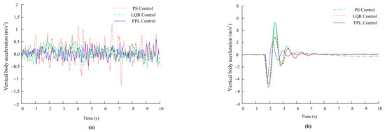 In order to simplify the expression, the control algorithm is simplified as follows in the simulation: PS represents the passive suspension, LQR represents the constraint adaptive control, and FPL represents the fuzzy PID-LQG integrated control designed in this paper. In order to ensure the scientific comparison, the control algorithm comparison simulation analysis follows the following assumptions: