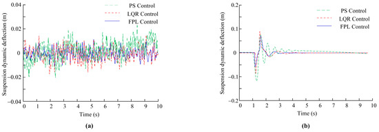 As shown in Figure 9, Figure 10 and Figure 11, compared with passive PS control and LQR adaptive control, FPL integrated control strategy was adopted for active suspension in this study, and the peak value of vertical acceleration of the body, the peak value of dynamic deflection of the suspension and the peak value of dynamic load of the wheel were significantly reduced when facing the excitation condition of C-class road surface and 0.11 m raised road surface. At the same time, the active suspension controller exhibited faster output response and better real-time performance. Especially under the excitation of 0.11 m raised road surface, the oscillation times of the waveform were greatly reduced and quickly became a stable state.