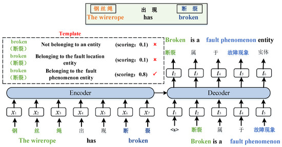 An example of the NER process based on template prompt learning is shown in Figure 2. For example, for the input text “The wirerope has broken (“钢丝绳出现断裂”)”, several sets of template text corresponding to whether each phrase is a specific entity type must be constructed, such as “broken is a failure phenomenon”. In the training phase, template samples of all entity and non-entity types are built according to the labels. At the same time, multiple sets of text generated from the templates are predicted in the decoder. In the case of “The wirerope has broken (“钢丝绳出现断裂”)”, the decoder aims to create the text “broken is a failure phenomenon entity” using the template output. The decoder can score the text constructed from the template based on the original input. Suppose the sentence “The broken belongs to the entity of the failure phenomenon (“断裂属于故障现象实体”) (FP)” scores highly. In Figure 2, “
