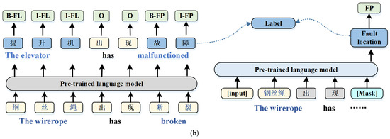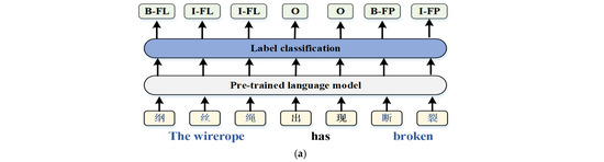 As shown in Figure 3b, when the input “The wirerope has broken (“钢丝绳出现断裂”)” is given, TFP-NER is trained to predict a label word “elevator (“提升机”)” at the location of the entity “wirerope (“钢丝绳”)” as an indication of the label “FL”. For the non-entity word “has,” the model still predicts the original word. Firstly, we construct a set of labeled words , which is connected to the set of task labels through the mapping function . Given an input sentence , which contains a series of elements , and a corresponding tag sequence , the sequence contains the tags . Construct a target sentence by replacing at entity position (assuming is an entity label) with the corresponding labeled word , and keeping the original word entity position. Then, given the original input , train the LM to maximize the probability of the target sentence , which is expressed as Equation (1):