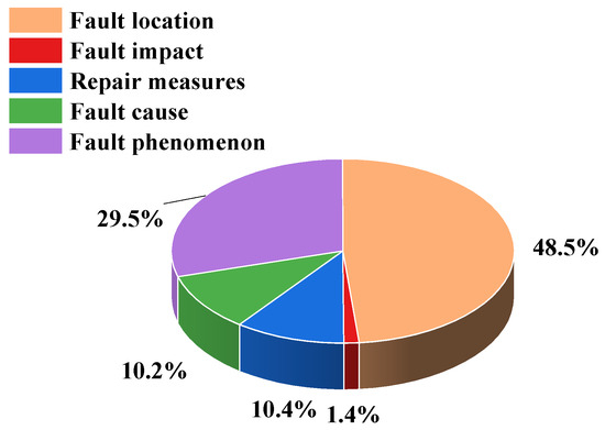 (a) The MEFD dataset is a high-quality corpus of fault-named entities manually constructed by the research group. It is built by collecting point inspection forms and maintenance logs from the lifting work area of a state-owned mega non-ferrous metal group, fault-related journal papers, and master’s and doctoral theses in the field. The dataset contains a total of 7733 entities. Using the Label-Studio tool, the entities are annotated, and the distribution of different entity types in the MEFD dataset is presented in Table 2; other categories of entities are represented in Figure 4.