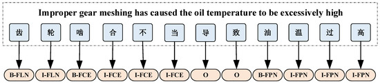 An example of entity labeling is illustrated in Figure 5. The original text shown in Figure 5 is “齿轮啮合不当导致油温过高 (“Improper gear meshing leads to high oil temperature”)”. In this example, there are three entities: “gear”, “improper meshing”, and “high oil temperature”. “齿轮 (“Gear”)” is the fault location (FL) entity, “啮合不当 (“improper meshing”)” is the fault cause (FC) entity, “油温过高 (“high oil temperature”)” is the fault phenomenon (FP) entity, and “导致(”leads to”)” is not an entity. The corresponding entities were annotated using the “BIO” annotation method, with the first token labeled as “B-” and the remaining tokens labeled as “I-”.