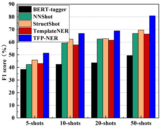 To verify the TFP-NER model’s entity recognition performance, the BERT-tagger [25], NNShot model [37], StructShot model [37], and TemplateNER [30] models were selected for comparative experiments on the MEFD dataset. The results are presented in Table 4 and Figure 6.