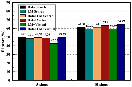As introduced in Section 3.3 regarding tag word selection methods, this section conducts ablation experiments on four tag word selection methods based on TFP-NER. These methods include the data distribution search (Data Search), language model search (LM Search), data distribution search fused with a language model (Data + LM Search), data distribution search fused with virtual word selection (Data + Virtual), language model fusion with virtual word selection (LM + Virtual), and data distribution search fusion with a language model and virtual word selection (Data + LM + Virtual), totaling six methods. The experimental results are presented in Figure 7.