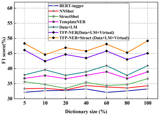 The TFP-NER model integrates untagged data and dictionary annotations for tagged word selection. In this experiment, the strengths and limitations of the TFP-NER method in practical applications are further revealed by examining the impact of dictionary quality on the performance of the MEFD dataset. To comprehensively assess the effects of lexicon quality, an entity frequency weight sampling approach was adopted to generate lexicons of varying sizes, ranging from 5% to 80% of the original lexicon size. The impact of TFP-NER and the baseline model on lexicon size is illustrated in Figure 8.