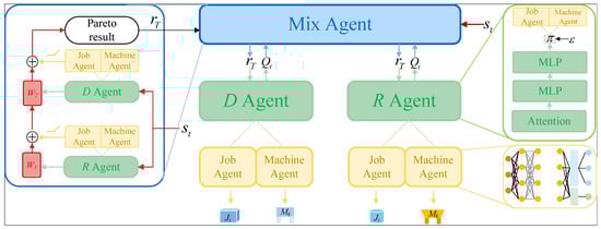 In dynamic scenario optimization based on deep reinforcement learning, conventional DQN often suffers from policy oscillations due to value estimation bias [24], and their single-objective optimization struggles to satisfy the multiple demands of complex natural industrial environments. This paper presents a hierarchical framework of an Improved Double Deep Q-network (IDDQN-II) that integrates dual-objective optimization to tackle these challenges. The proposed algorithm reduces overall job tardiness and machine offset by creating a decoupled value evaluation agent and a structured decision-making process. The framework of IDDQN-II is depicted in Figure 1. The core of the algorithm is centrally located in the figure, and a hierarchical framework assigns various algorithm layers to different functions. Simultaneously, each layer’s working agent mode is displayed in the same-colored boxes. Each layer must work together to output a complete solution, but they are independent at runtime. The layer combines each lower layer to achieve its own function, and each lower layer feeds back to the upper layer in competition.