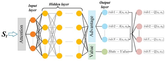 Each agent corresponds to a weight parameter, and , where . The action selection strategy in this paper is given by Equation (13).