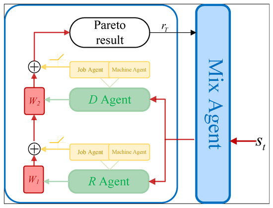The dual-objective optimization algorithm based on hierarchical IDDQN-II proposed in this paper decouples the two optimization objectives during training. However, the two objectives must be reconnected during the testing processes to obtain the Pareto results. The adaptive weight method is a strategy for dynamically adjusting the weight coefficients of each objective function in multi-objective optimization problems. It aims to autonomously balance the competing relationships among different objectives based on the real-time solution set distribution or environmental conditions, thereby avoiding the bias in the optimization direction caused by fixed weights during training. The adaptive weight method is applied to the top-level agent in the hierarchical IDDQN-II framework to generate Pareto results. Moreover, makes it vary uniformly between the outputs of the two optimization objective agents, enabling the agent to explore the Pareto frontier more effectively. The output structure is shown in Figure 3.