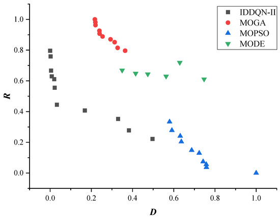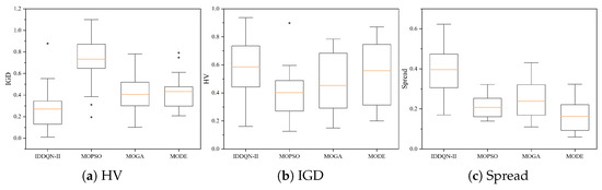 This section compares the proposed DRL algorithm IDDQN-II with three commonly used multi-objective algorithms on the same test set to validate its effectiveness. Three widely used indicators Hypervolume (HV) [34], Spread (S) [35], and Inverted Generational Distance (IGD) [36] are adopted to comprehensively assess performance from multiple perspectives. HV can comprehensively assess an algorithm’s overall performance regarding convergence and distribution. IGD effectively measures convergence accuracy by calculating the distance between the solution set and the true Pareto frontier. Meanwhile, Spread specifically evaluates the uniformity of the solution set’s distribution. These three indicators represent essential dimensions in multi-objective optimization evaluation, and they are complementary and widely recognized in the field. Pareto results, often derived from Pareto efficiency or optimality, refer to outcomes in economic, decision-making, or multi-objective optimization scenarios where it is impossible to improve one criterion or individual’s situation without worsening another. These results are fundamental in evaluating resource allocation and strategic decisions across disciplines such as economics, game theory, and engineering. A solution is Pareto optimal if no other feasible solution can make at least one party better off without making someone else worse off. In practical applications—such as trade-offs between cost and performance in engineering design or policy evaluations—Pareto results are used to identify sets of non-dominated solutions, helping decision-makers visualize efficient frontiers and make informed, balanced choices among competing objectives.