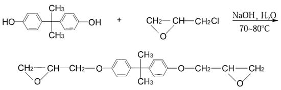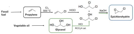 The majority of commercial epoxy resins are glycidyl-type epoxy resins synthesized by the reaction of active hydrogen in phenols, alcohols, amines, and acids with epichlorohydrin at certain well-controlled conditions. Most of these chemicals, including epichlorohydrin, originate from fossil fuels. Conventional epichlorohydrin is prepared by the reaction of propylene, originating from petroleum as well known, and chlorine. Recently, 100% bio-based epichlorohydrin has been developed and successfully commercialized. The bio-based epichlorohydrin is synthesized by the reaction of hydrochloric acid with renewable glycerol derived from vegetable oil as a byproduct in the preparation of biodiesel and oleochemical products. The preparation method of conventional fossil-based and new bio-based epichlorohydrin is shown in Figure 1 [43]. The bio-based epichlorohydrin has been used to replace conventional fossil-based epichlorohydrin in the commercial production of bio-based epoxy resins.