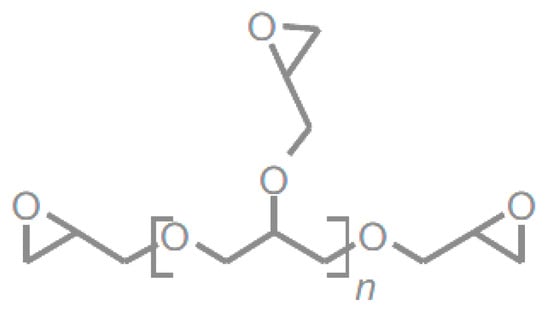Sorbitol-based epoxy resin can be prepared by the reaction of sorbitol with epichlorohydrin. Its bio-based carbon content can achieve nearly 100% by combination use of bio-based epichlorohydrin in the production. Sorbitol-based epoxy resin has been commercialized and supplied by several epoxy resin suppliers [58,59,60,61]. It is a multi-functional glycidyl-ether-type epoxy resin. The typical chemical structure of sorbitol-based epoxy resin is shown in Figure 10.