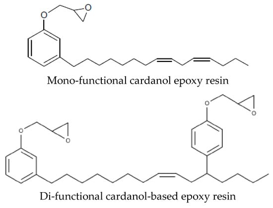 Cardanol is a phenolic liquid, derived from biomass cashew nuts. It is the main component of cashew nutshell liquid (CNSL) (https://en.wikipedia.org/wiki/Cashew_nutshell_liquid (accessed on 17 December 2024) Cardanol-based epoxy resins are produced by the reaction of cardanol with epichlorohydrin, and their bio-based carbon content can achieve 100%. Mono-functional, di-functional, and multi-functional cardanol-based epoxy resins have been commercialized by Cardolite Corporation [55]. Mono-functional cardanol-based epoxy resin has relatively low viscosity and can be used as a diluent. The chemical structure of cardanol-based epoxy resin is shown in Figure 7.