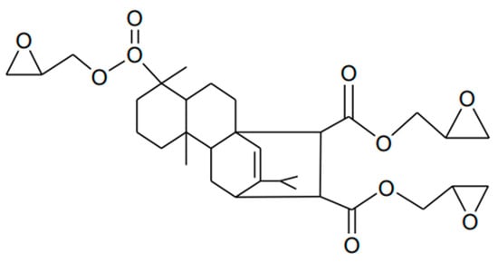 Rosin is a biomass solid material derived via bio-refinery from pine trees and other plants, such as conifers. Rosin contains resin acids, especially abietic aid. Rosin-based epoxy resin is a glycidyl-ester-type epoxy resin, prepared by the reaction of rosin acid with epichlorohydrin. Its bio-based carbon content can achieve nearly 100% with the use of bio-based epichlorohydrin. Rosin-based epoxy resins have been commercialized by Ingevity Corporation [56]. The chemical structure of tri-functional rosin-based epoxy resin is shown in Figure 8.