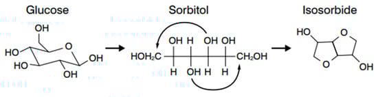 Sorbitol is a sugar alcohol, derived from the glucose in saccharides of biomass potato starch and corn starch. Isosorbide is prepared by the dehydration of sorbitol, as shown in Figure 9 [57].