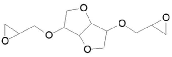 Isosorbide-based epoxy resin can be prepared by the reaction of isosorbide with epichlorohydrin. Its bio-based carbon content can also achieve nearly 100% by combination use of bio-based epichlorohydrin in the production. Isosorbide-based epoxy resin has been commercialized and supplied by several epoxy resin suppliers [62,63]. It is a di-functional glycidyl-ether-type epoxy resin and can potentially be used as a base resin because of a relatively strong building-block structure. Typical chemical structure of isosorbide-based epoxy resin is shown in Figure 11.
