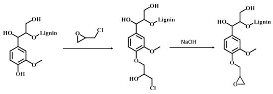 Lignin is one of the three main components of wood, together with cellulose and hemi-cellulose. Chemically, lignin is a polymer comprising cross-linked phenolic precursors. It is the second-most abundant biopolymer only behind cellulose and is the most abundant bio-aromatic compound [64]. Lots of studies have been carried out to prepare lignin-based epoxy resin and investigate its properties and performance, aiming to establish a useful level of bio-replacement on bisphenol A in epoxy resin technology [65,66,67,68,69,70,71]. Commercial preparation of bio-based lignin-based epoxy resins, however, is still at an early investigation stage, due to the complex structure of lignin material. Figure 12 illustrates one preparation route of lignin-based epoxy resin, synthesized by the reaction of lignin’s phenolic hydroxy group with epichlorohydrin [72].