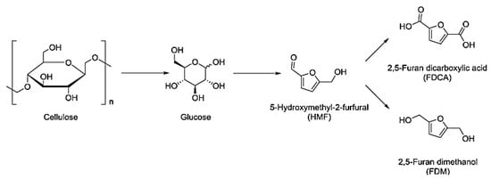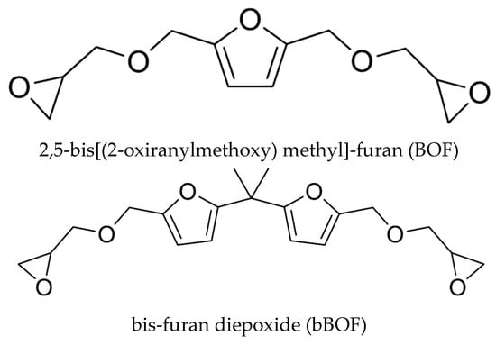 As illustrated in Figure 13, furfural compounds can be prepared from cellulose, the most abundant natural biopolymer derived from various plants. Furan-based epoxy resin can be prepared by the reaction of alcohol or acid furan compounds with epichlorohydrin. The maximum bio-based carbon content can achieve 100% with combination use of bio-based epichlorohydrin. Great efforts have been paid to develop and investigate furan-based epoxy resins, as they are potentially expected to replace fossil-derived bisphenol A due to its aromatic chrematistics [73,74,75,76,77]. Figure 14 shows the chemical structure of two di-functional furan-based epoxy resins.