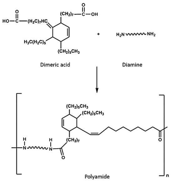 Polyamide-type curing agents are prepared by the reaction of dimeric acid, derived from biomass tall oil, with excessive polyamine, as illustrated in Figure 18 [93]. Polyamide has higher viscosity, lower toxicity, and longer pot-life than polyamines. Polyamide curing agents show good adhesion, good flexibility, and toughness. Up to 70% bio-based carbon content can be achieved depending on the addition ratio of dimeric acid applied in its synthesis [94,95].