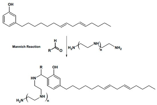 Bio-based phenalkamine is a Mannich reaction product of polyamine with biomass-derived cardanol, and aldehyde, as illustrated in Figure 19 [96,97]. Bio-based phenalkamine-type curing agents offer fast curability and good chemical resistance. Up to nearly 90% bio-based carbon content can be achieved depending on the addition ratio of cardanol applied in its synthesis.