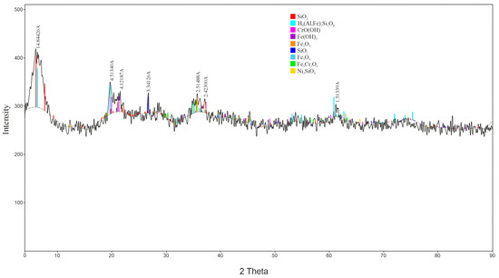 According to the results of X-ray structural analysis (X-ray diffractometer D8 Advance BRUKER, Karlsruhe, Germany) (Figure 3), the low-grade nickel ore consists of quartz, nontronite, chromium metahydroxide, goethite, magnetite, and iron chromite. Nickel is present in the form of nickel (II) silicate.