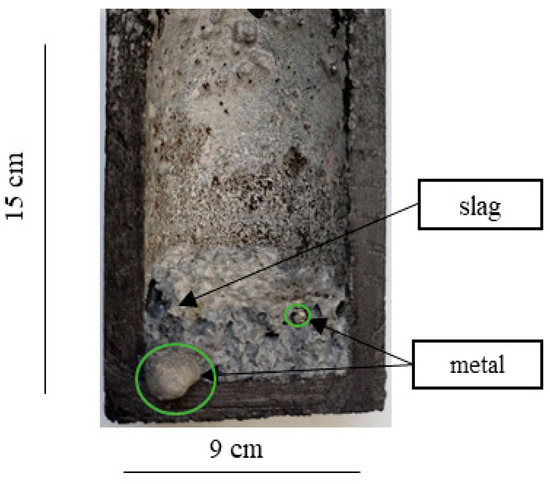 Figure 4 shows the products obtained from smelting using option II. As seen, the metal and slag are clearly separated. It should be noted that no significant gas emissions were recorded during the smelting process.