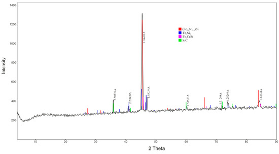 X-ray phase analysis of the obtained product samples revealed that the nickel–chromium-containing alloy consists of the following phases: Fe2Ni0.6Si, Fe5Si3, and Fe2CrSi (Figure 5).